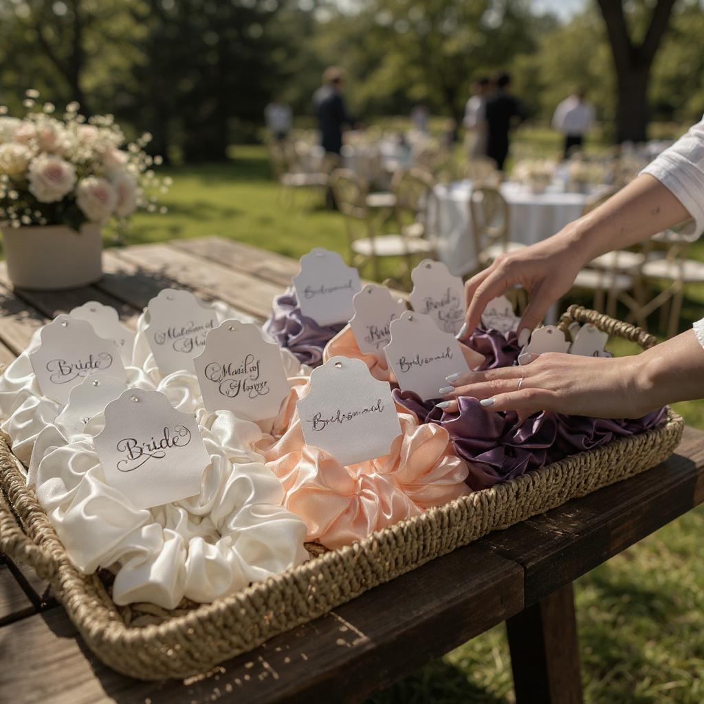 Whether you're prepping for the big day, posing for photos, or slipping one into a gift box, these scrunchies bring just the right touch of sparkle and sentiment.