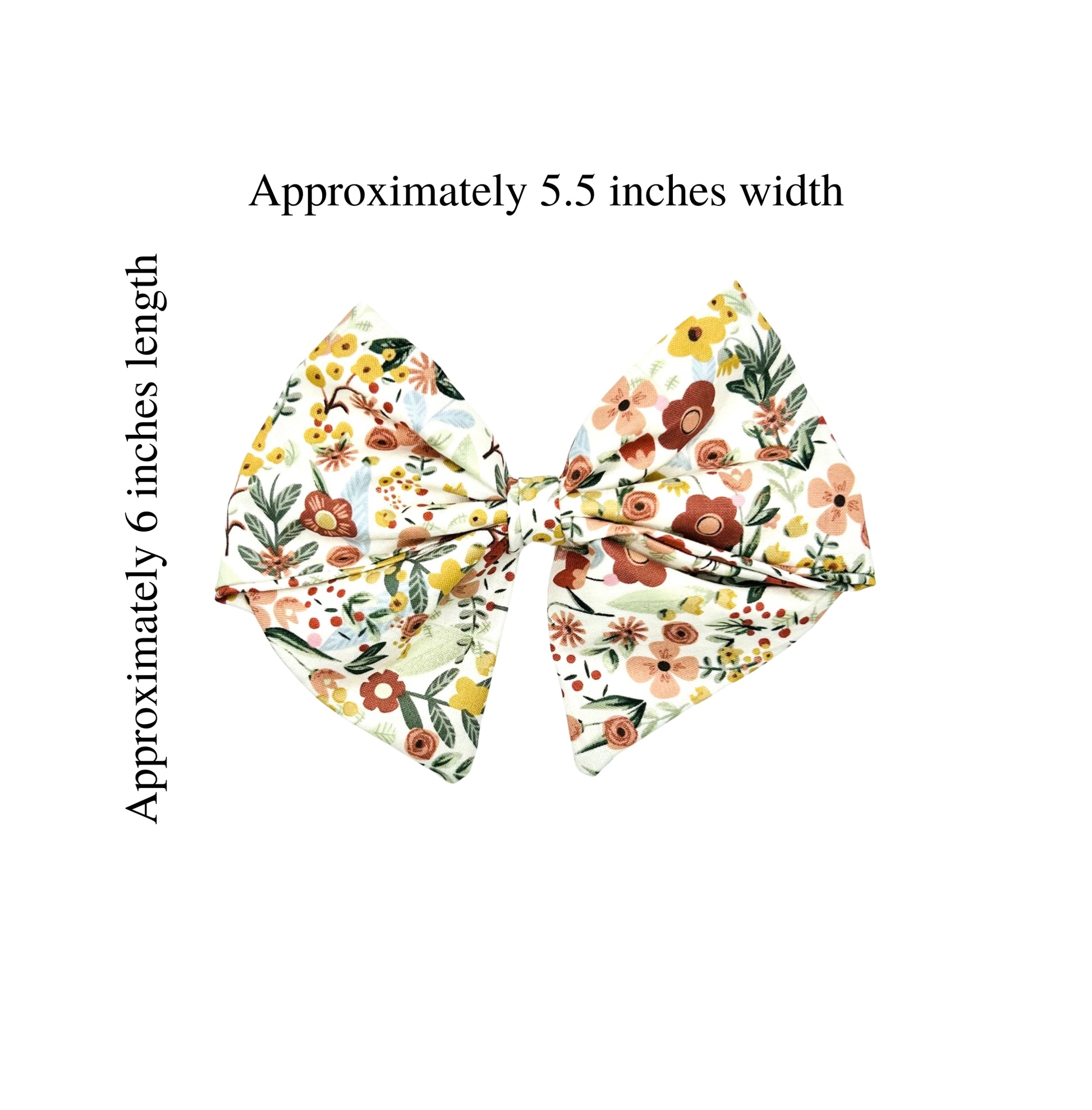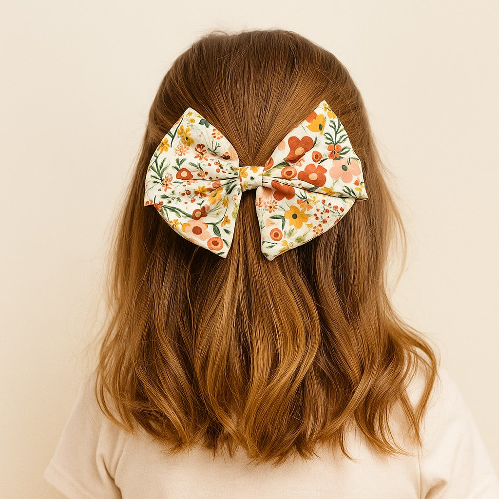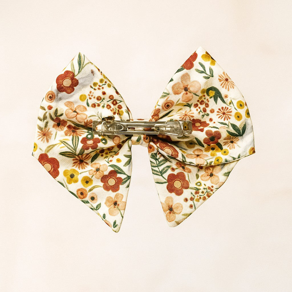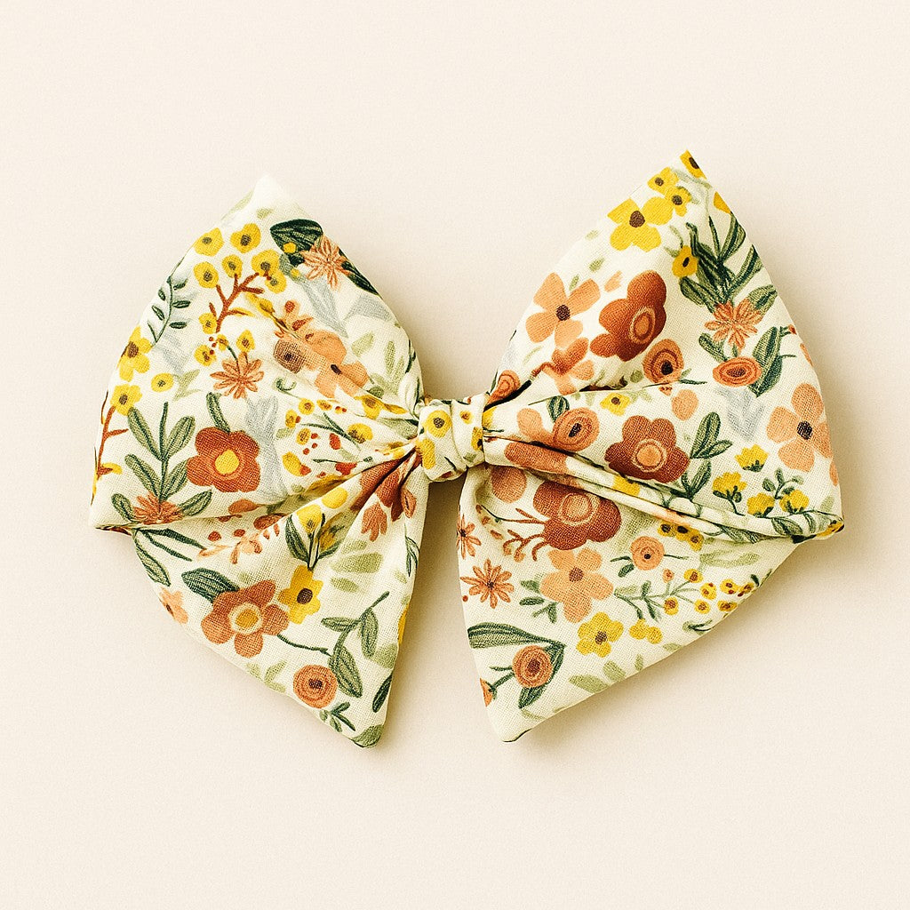 Bring sunshine to your style with our Eden Floral Sailor Bow! Handmade from soft cotton, this bright yellow floral bow secures all hair types with light, cheerful charm.