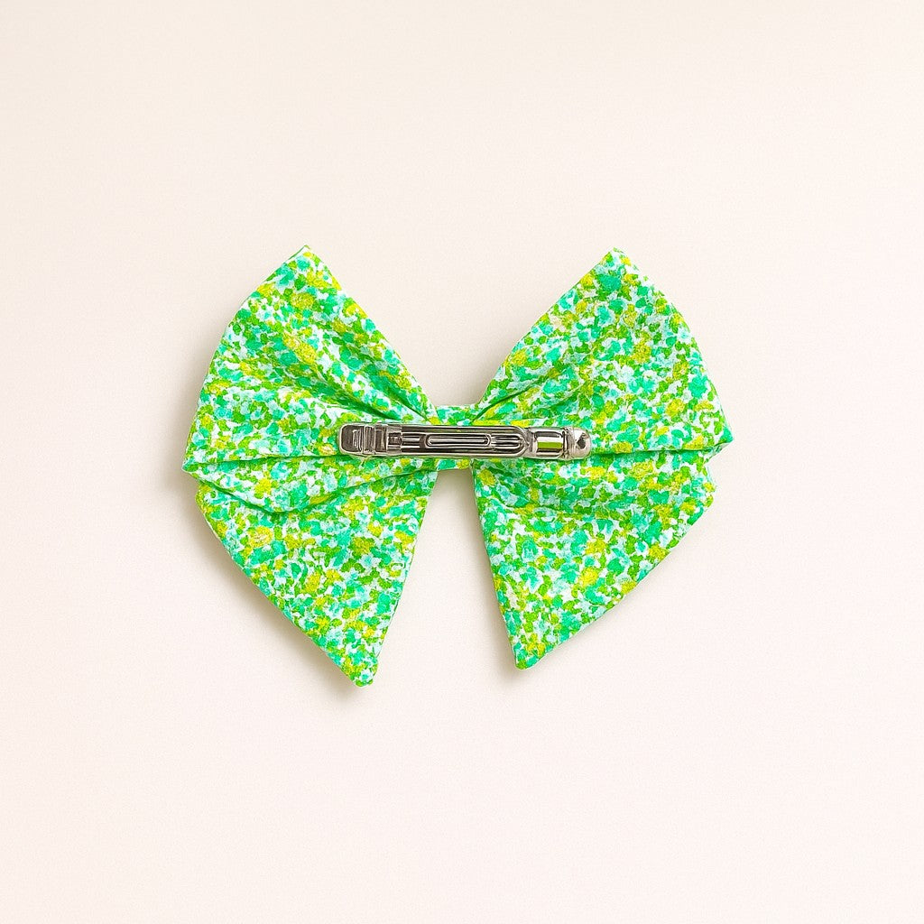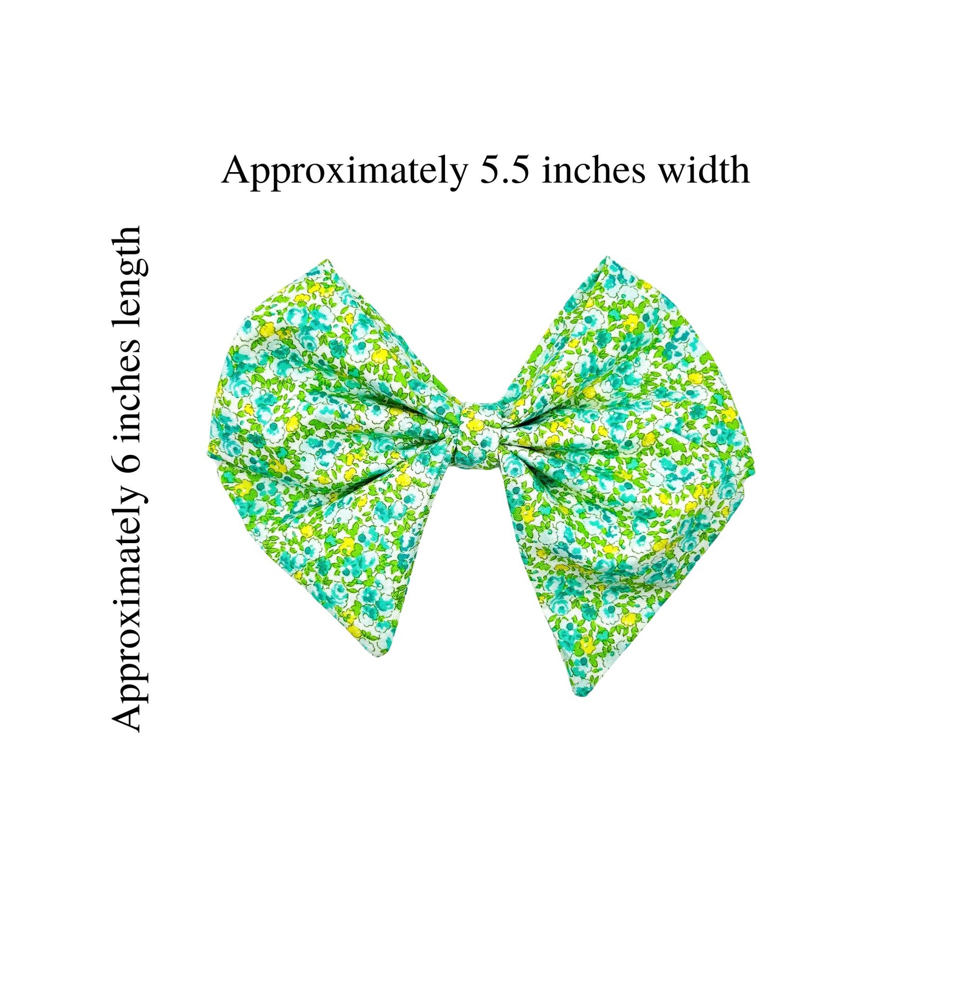Meet Jasmine: a handmade cotton sailor bow featuring cheerful green and yellow florals. Lightweight and durable, it's perfect for adding bright style to all hair types.