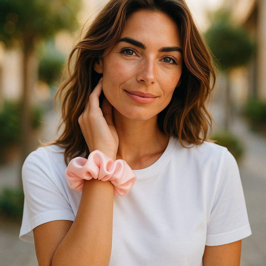 Embrace charm with our Pink Satin Scrunchie, handmade for thick, curly, or heavy hair. Its soft shine and strong hold make it perfect for daily glam or casual chic.
