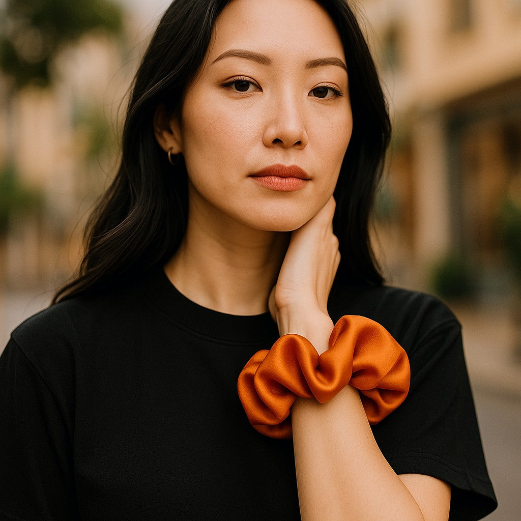 Meet our Terracotta Satin Scrunchie: handmade for thick, curly, or heavy hair. With its warm tone and soft satin shine, it offers effortless hold with natural beauty.